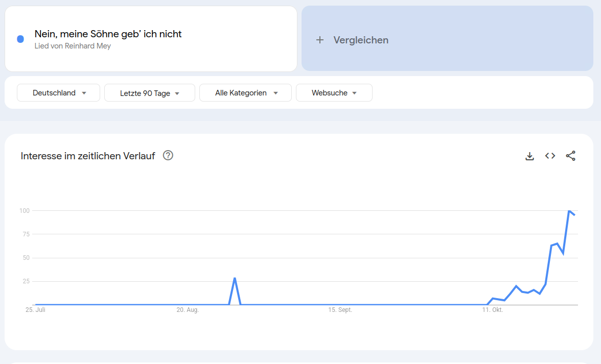 Dieser Artikel erschien erstmals am 26.10.2025. Das Artikelbild zeigt einen Ausschnitt aus Google Trends am 25.10.2025, zur Suche nach „Nein, meine Söhne geb‘ ich nicht“